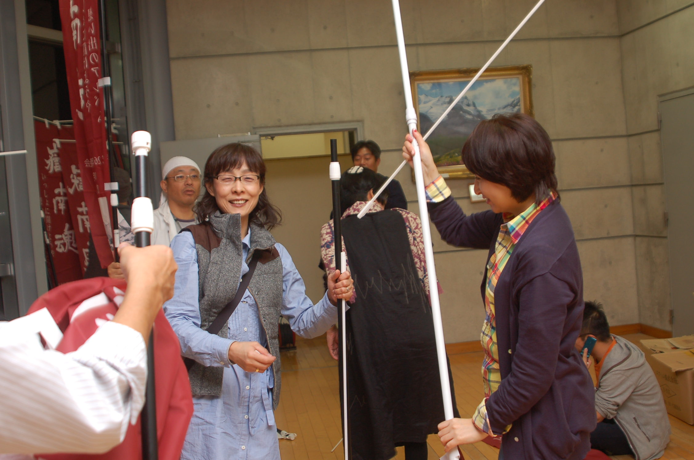 遊んでるんじゃありません。旗を組み立てています。何事も楽しく!がモットーです♪