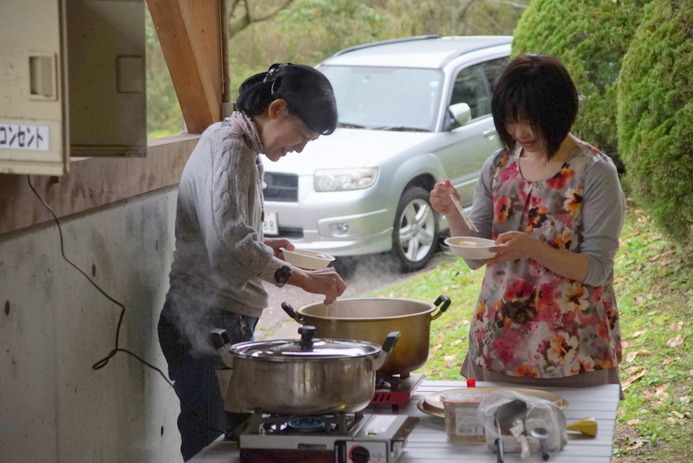宴会では、それぞれ持ち寄った「上半おでん」や林久右ヱ門の出汁で取った貝汁。梅雀買い出しの丸岡餃子、